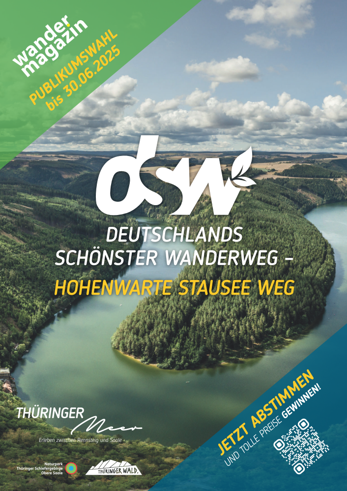 Am 1. März hat die große Publikumswahl für “Deutschlands schönsten Wanderweg” begonnen. Wanderfreunde aus ganz Deutschland können ihre Stimme für den Hohenwarte Stausee Weg abgeben und dazu beitragen, dass er sich gegen starke Konkurrenz durchsetzt. Die Jury des Wandermagazins, u.a. bestehend aus Chefredakteur Thorsten Hoyer, Wanderbuchautor Manuel Andrack und der Bloggerin Kathrin Heckmann alias Fräulein Draußen, haben aus 74 Bewerbungen die 10 Mehrtages- und 10 Tagestouren bestimmt, die sich der Publikumswahl stellen dürfen. Die Abstimmung ist online bis 30.06.2025 auf www.wandermagazin.de/wahlstudio möglich, zudem sind Wahlkarten in den Tourist-Informationen und bei vielen Partnern in der Region erhältlich.