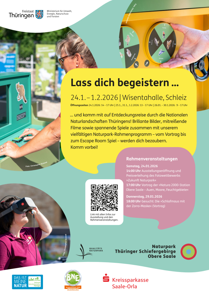 „Lass dich begeistern!“ – getreu diesem Motto haben Thüringens acht Nationalen Naturlandschaften (NNL) eine spannende und interaktive Wanderausstellung für Groß und Klein konzipiert. Zahlreiche Filme, Interaktionsmöglichkeiten und Spiele lassen Besuchende die reizvolle Natur in Thüringen mit allen Sinnen wahrnehmen und entdecken. Die Ausstellung wandert jährlich durch die NNL Thüringen – im Januar 2026 ist sie nun in Schleiz zu sehen. Das Team der Naturpark-Verwaltung freut sich auf Ihren Besuch!